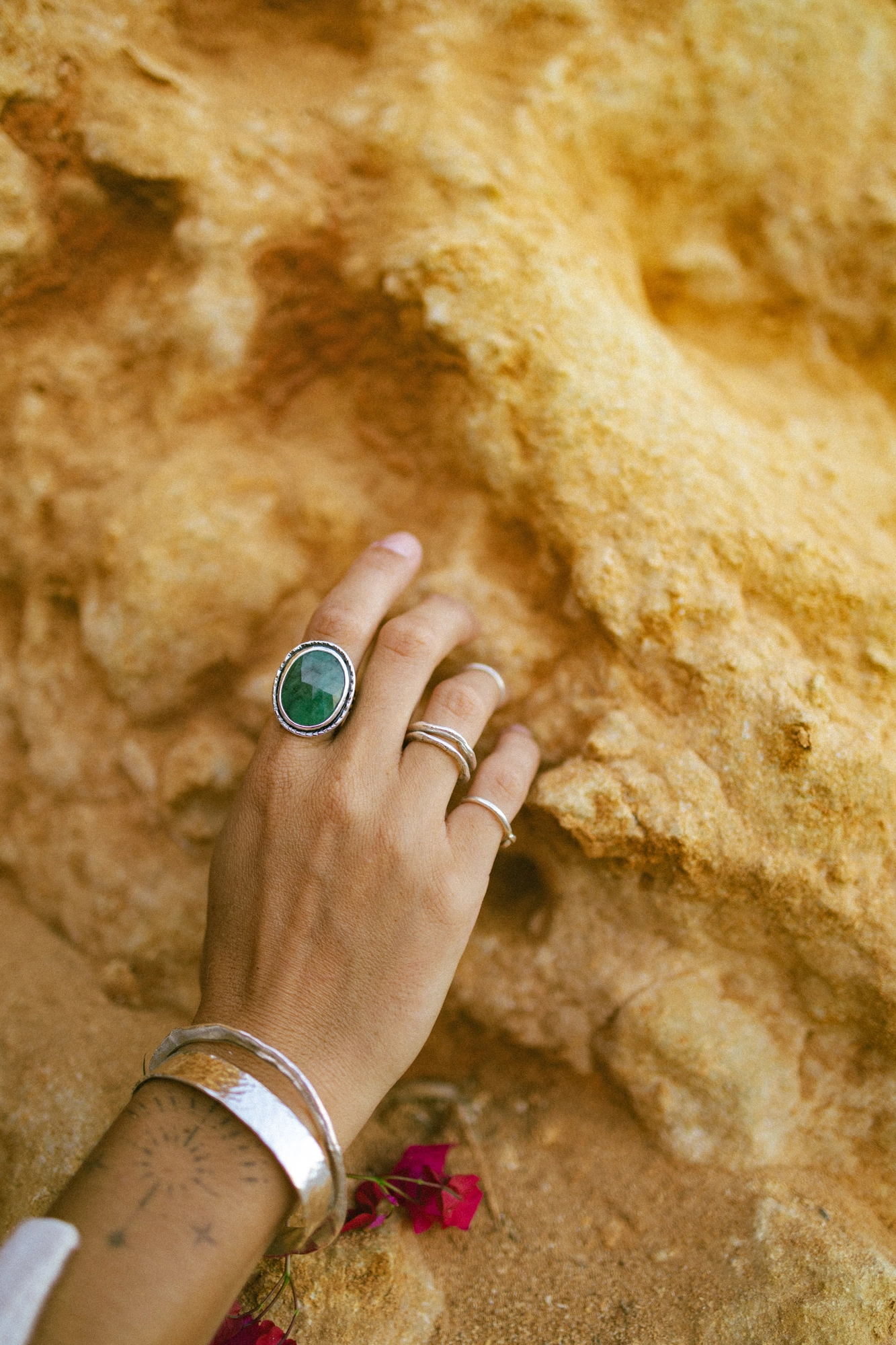 • Anillo de plata con piedra esmeralda ovalada facetada de tonos verdes intensos.